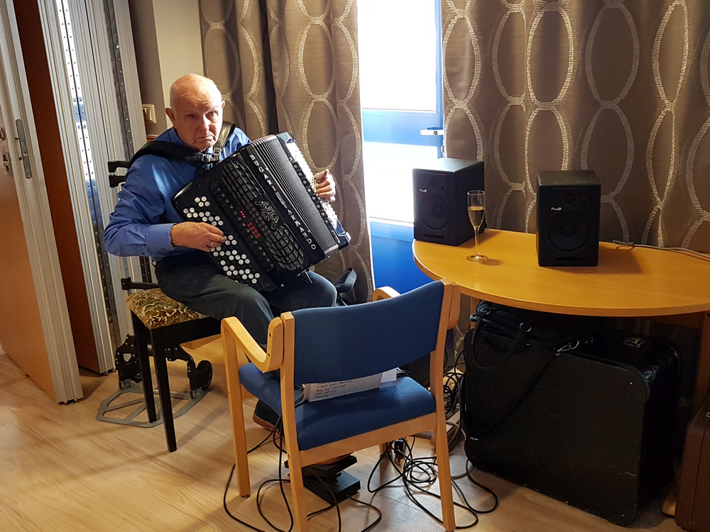 Peder Andersen fikk også overrakt en oppmerksomhet som takk at han stiller opp med fin musikk.